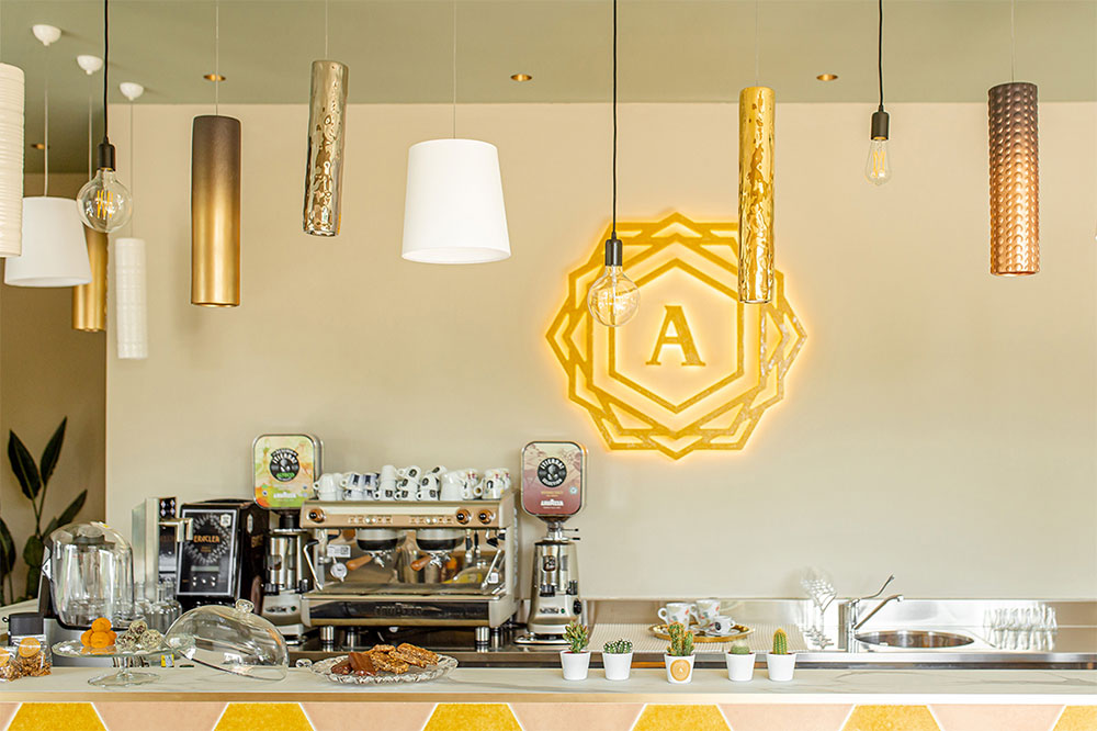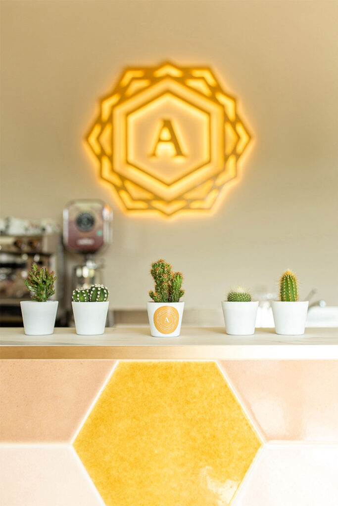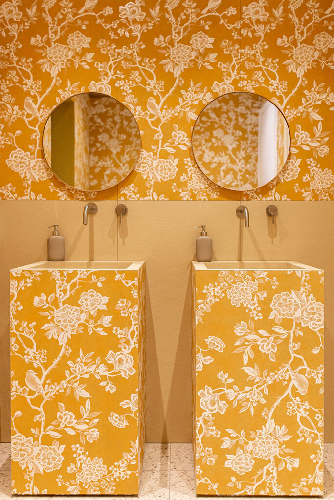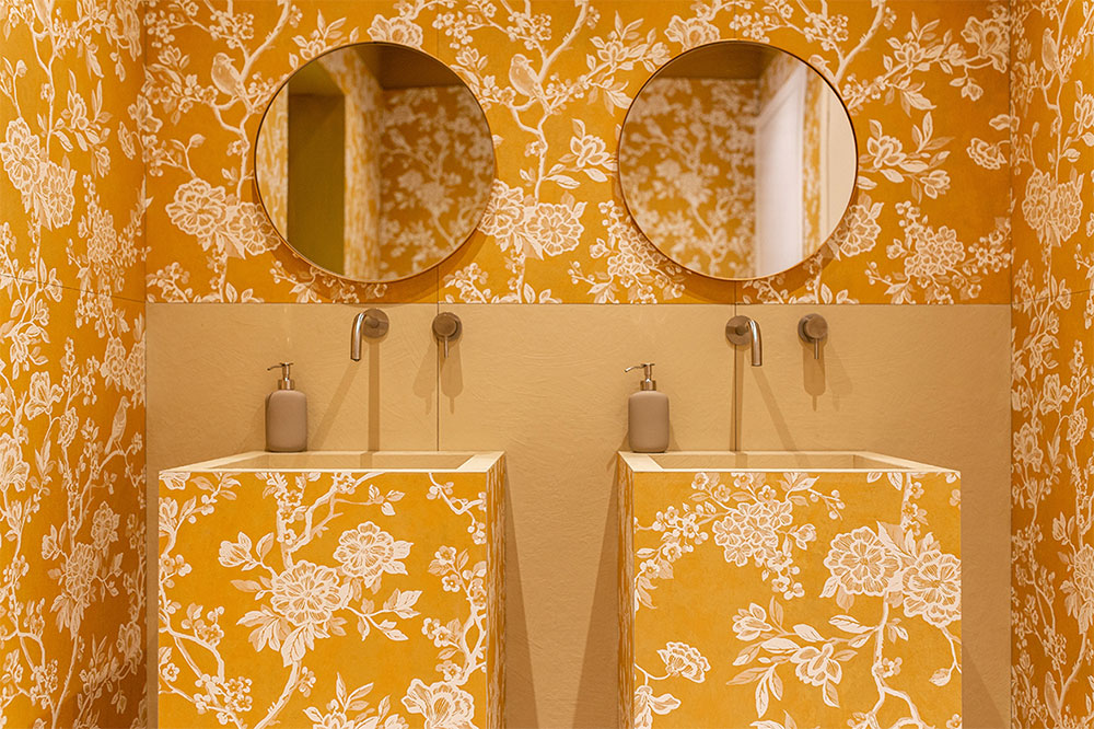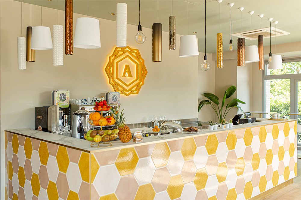 Per risolvere le esigenze stilistiche del locale, Gruppo Romani ha realizzato, attraverso la divisione Cerasarda Custom, prodotti “su misura” che declinano in scala cromatica il colore giallo del logo. Per il bancone dell’Amber Cafè sono state scelte le caratteristiche esagone di Cir Ceramiche, mentre per le pareti dei bagni e per il rivestimento di elementi di arredo, l’esclusivo soggetto decorativo effetto wallpaper Chromagic Floral. Il brand Atelier Cerasarda ha creato in esclusiva le proposte coordinate per la mise en place.